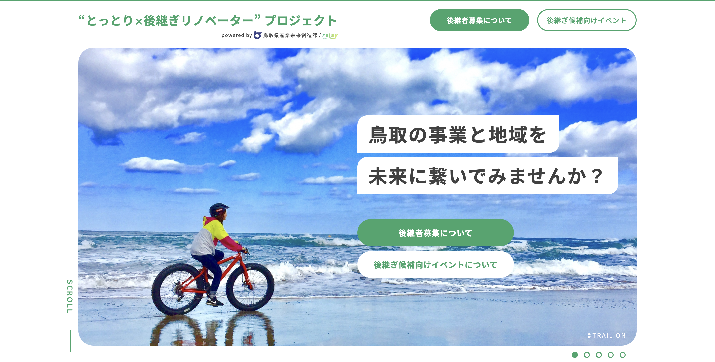 事業承継マッチングプラットフォーム「relay(リレイ)」を運営する株式会社ライトライト(本社:宮崎県宮崎市 / 代表取締役:齋藤隆太 / 以下、ライトライト)は、鳥取県と連携し、鳥取県内の事業承継支援を行う取組み「”とっとり×後継ぎリノベータ―”プロジェクト」を実施する。取り組みの実施に伴い、本プロジェクトの特設サイトを公開した。
