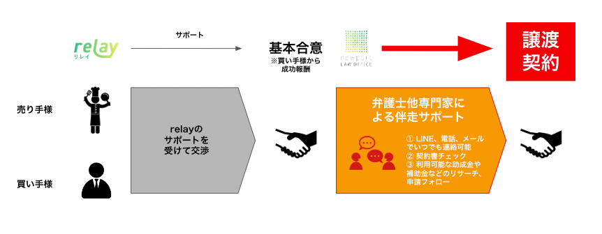 「relay継続フォローパック」は、relayを通じて売り手との事業承継の交渉を行う買い手候補のうち、基本合意を経た方に対して専門知識を持つ弁護士が、relayと連携しながら最終契約まで伴走するサービスです。