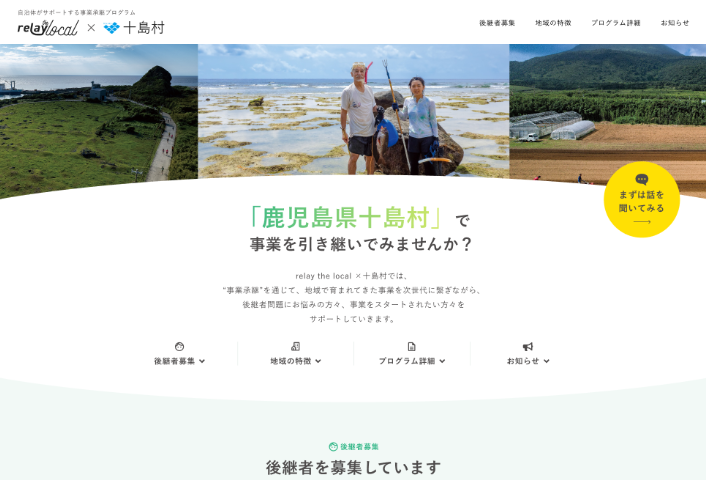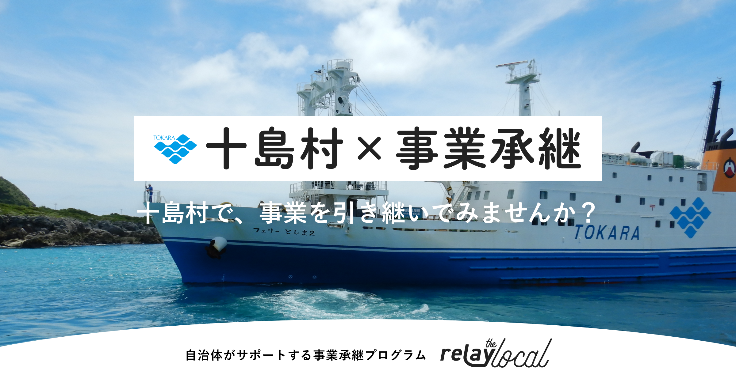 これに対して十島村とrelayは、移住・定住を伴う第三者事業承継の推進に向けて、十島村と共に取り組んでまいります。連携の第一弾として、十島村に特化した後継者募集案件を掲載した「relay the local 十島村」を開設しました。今後、十島村に相談が寄せられる後継者不在事業者の情報をrelayに提供いただき、「relay the local 十島村」への掲載を行います。