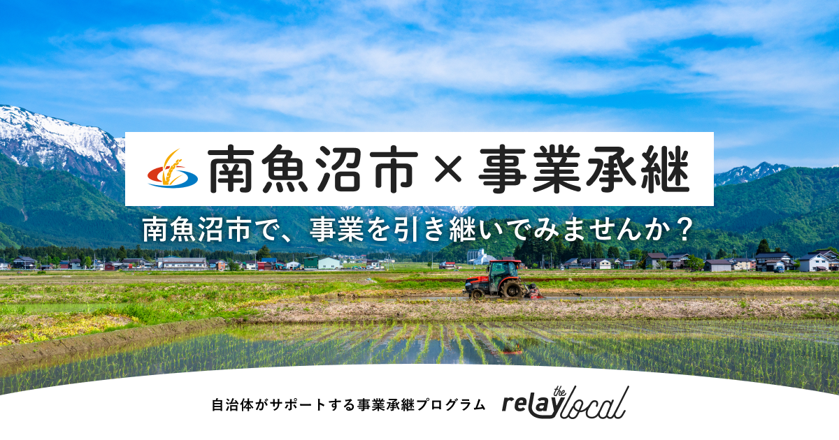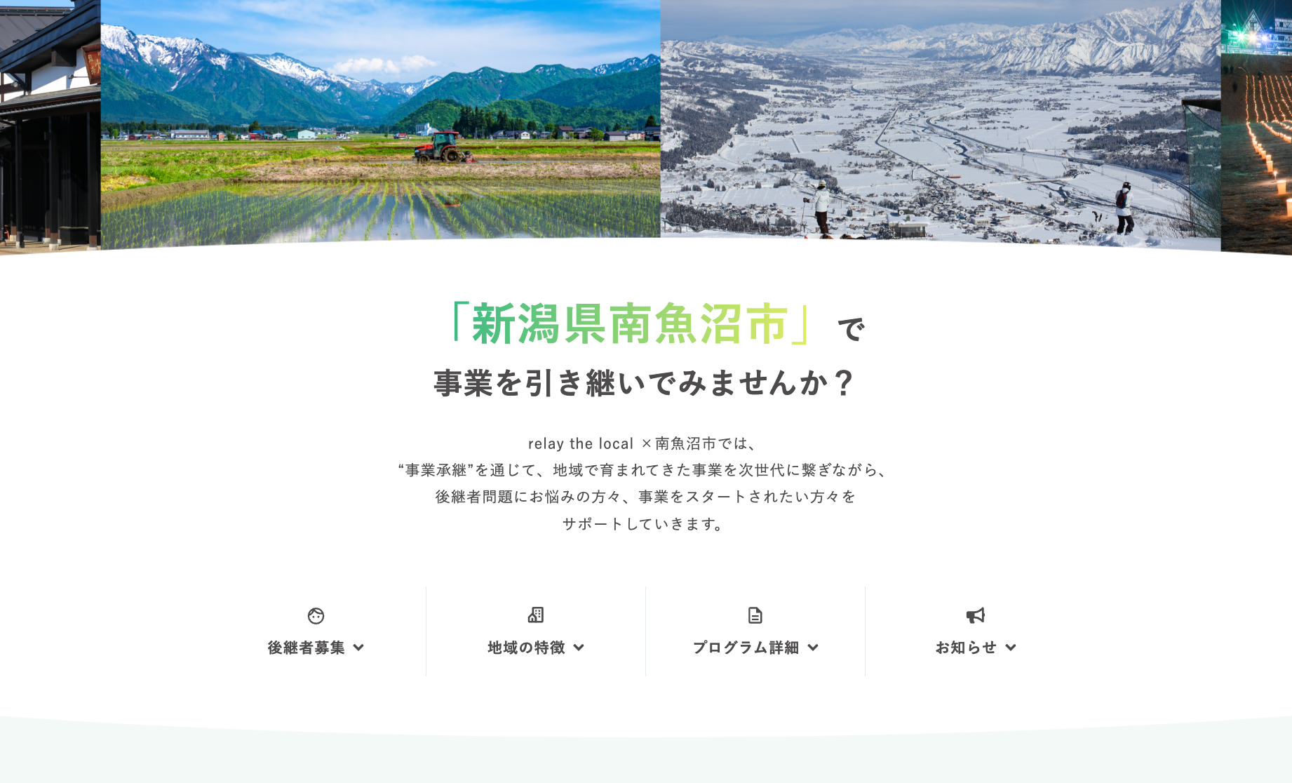このたび南魚沼市とrelayは、移住・定住を伴う第三者事業承継の推進に向けて、共に取り組んでまいります。提携の第一弾として、南魚沼市に特化した後継者募集案件を掲載した「relay the local 南魚沼市」を開設しました。今後、南魚沼市に相談が寄せられる後継者不在事業者の情報をrelayに提供いただき、「relay the local 南魚沼市」への掲載を行います。