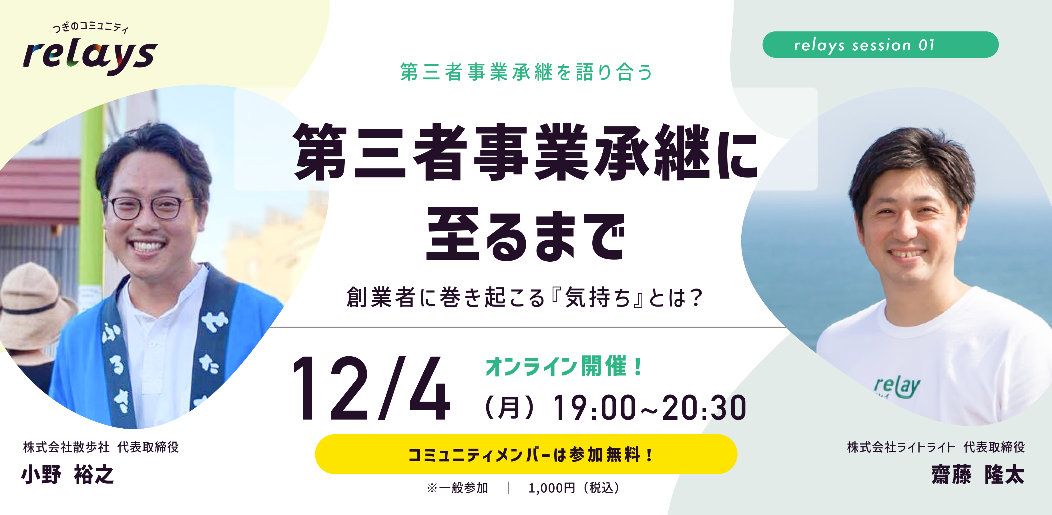 - 第三者承継コミュニティ「relays(リレイズ)」初期メンバー募集中!
