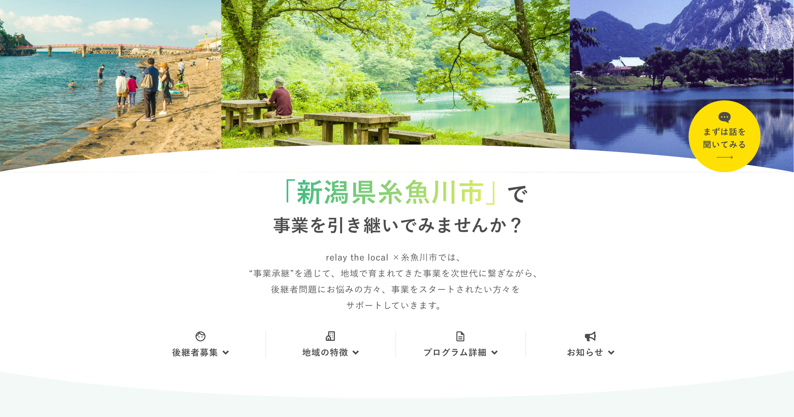 このたび糸魚川市とrelayは、移住・定住を伴う第三者事業承継の推進に向けて、共に取り組んでまいります。提携の第一弾として、糸魚川市に特化した後継者募集案件を掲載した「relay the local 糸魚川市」を開設しました。今後、糸魚川市に相談が寄せられる後継者不在事業者の情報をrelayに提供いただき、「relay the local 糸魚川市」への掲載を行います。