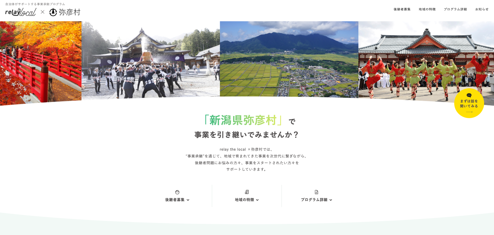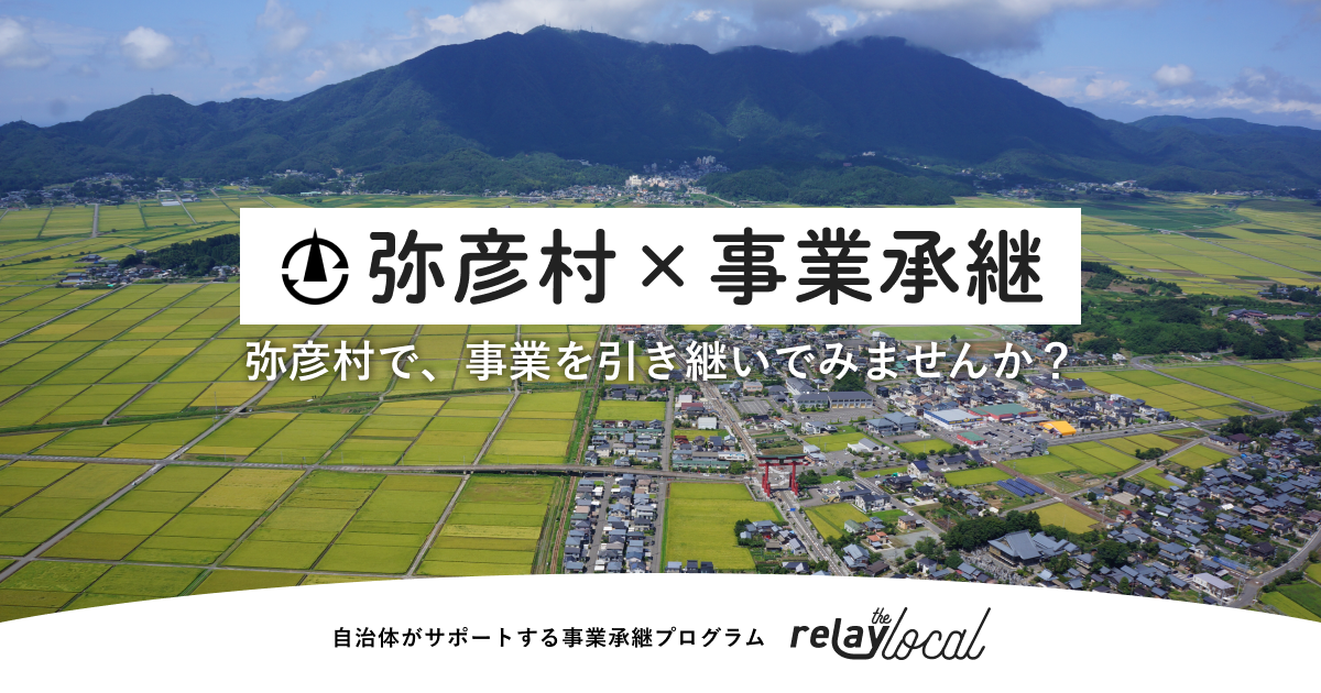このたび弥彦村とrelayは、移住・定住を伴う第三者事業承継の推進に向けて、共に取り組んでまいります。提携の第一弾として、弥彦村に特化した後継者を募集するページ「relay the local 弥彦村」を開設しました。今後、弥彦村に相談が寄せられる後継者不在事業者の情報をrelayに提供いただき、「relay the local 弥彦村」への掲載を行います。