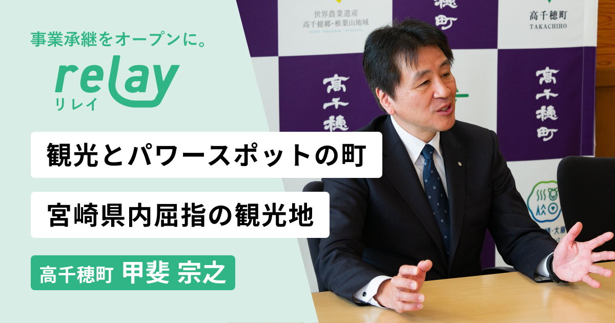 この度公開されたインタビュー記事では、宮崎県屈指の観光地でありすでに3件のマッチング事例を生み出している高千穂町の、後継者不在問題に対する課題感や、甲斐町長がrelayに期待することについてお話しいただきました。