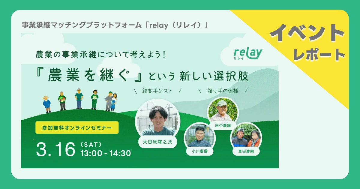 宮崎県内の農林水産業者の第三者事業承継の推進に向けて、宮崎県内の農林水産業者の後継者募集に特化した特設ページ「relay the local 宮崎県」の共同運営を行っている宮崎県とrelayはこの度、農業の事業承継をテーマにしたオンラインイベント「農業の事業承継について考えよう!『農業を継ぐ』という新しい選択肢」を3月16日(土)に共同開催しました。