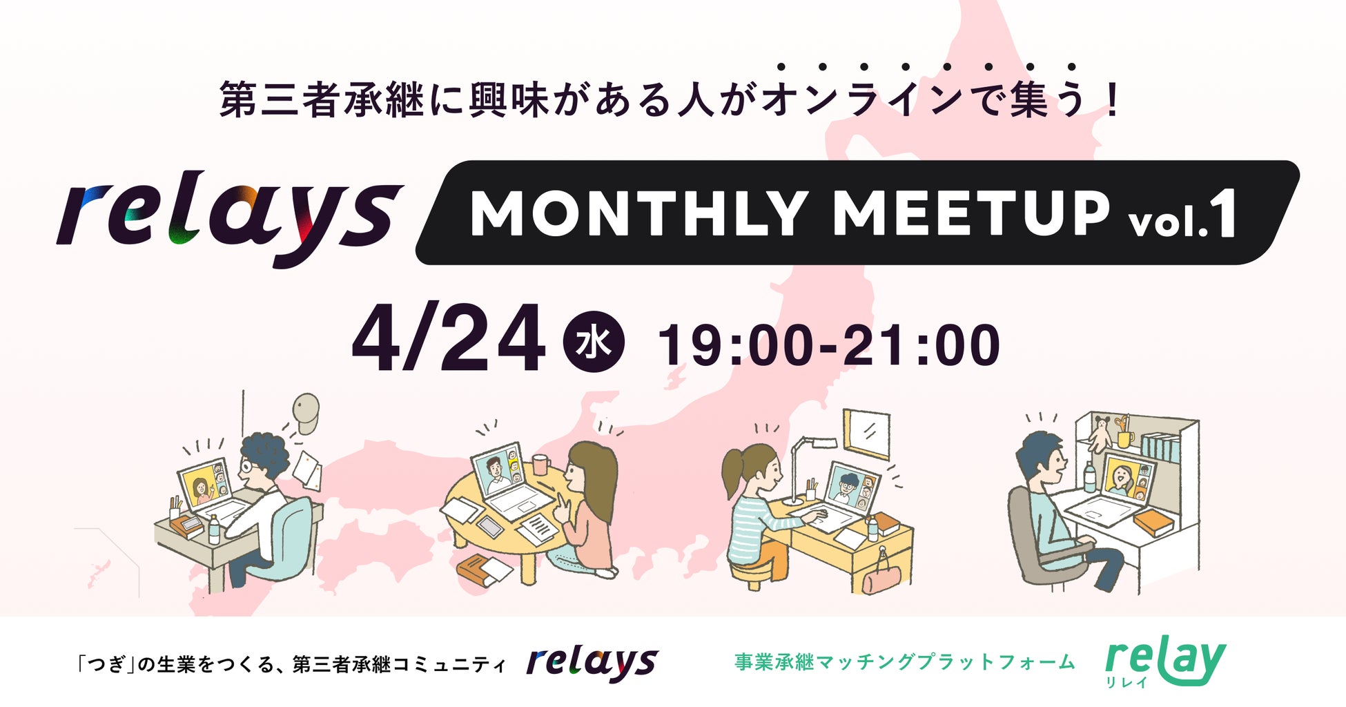 そしてこの度、第三者承継や地域での起業に興味のある方、地域を愛する方が毎月オンラインで集い、カジュアルに交流することを目的とした定期オンラインイベント「relays MONTHLY MEETUP」をスタートすることをお知らせいたします。第一弾は2024年4月24日(水)に開催し、relays会員は参加費無料です。