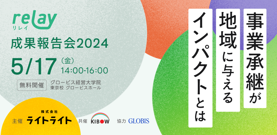 このたび、「地域に、光をあてる。」をミッションにおくライトライトは、relayでの事業承継をきっかけに、住みたい人が住みたい町に住み続けられる、持続可能な地域の未来を実現するための道筋と具体的な取り組み、および現在の進捗状況や社会的インパクトについて報告するイベント「成果報告会2024」〜事業承継が地域に与えるインパクトとは〜を開催いたします。