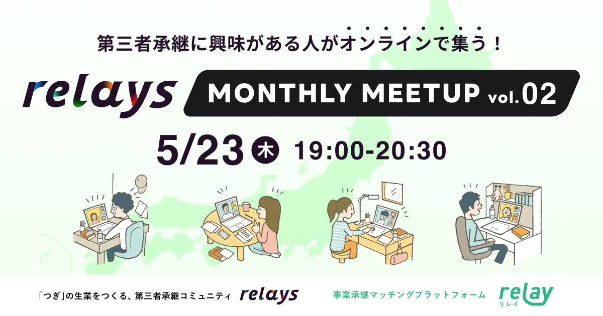 「relays MONTHLY MEETUP」は第三者承継や地域での起業に興味のある方、地域を愛する方が毎月オンラインで集い、カジュアルに交流することを目的としており、relays会員は参加費無料です(毎月定期開催予定・開催日時は決まり次第順次案内予定)。