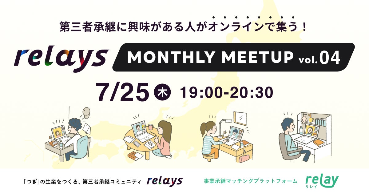 事業承継マッチングプラットフォーム「relay(リレイ)」を運営する株式会社ライトライト(宮崎県宮崎市 / 代表取締役:齋藤隆太)は、このたび第三者承継コミュニティ「relays(リレイズ)」にて、事業承継について気軽に話せ、交流できるオンラインイベント「relays MONTHLY MEETUP vol.4」を開催いたします。7月25日(木)19時〜開催、relays会員は参加費無料です。