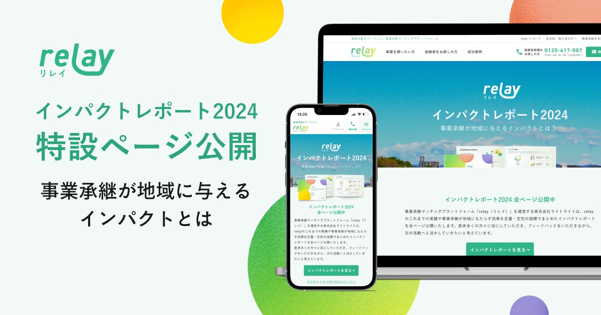 事業承継マッチングプラットフォーム「relay(リレイ)」を運営する株式会社ライトライト(宮崎県宮崎市 / 代表取締役:齋藤隆太 / 以下、ライトライト)は、relayのこれまでの実績や、事業承継が地域へあたえる社会的インパクトについてまとめた「relay インパクトレポート2024」特設ページを公開いたしました。