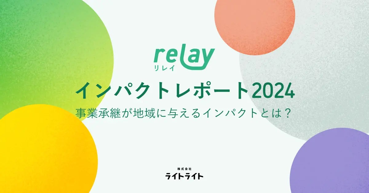 「地域に、光をあてる。」をミッションにおくライトライトは、事業承継マッチングプラットフォーム「relay(リレイ)」のこれまでの実績や、事業承継が地域へあたえる社会的インパクト(効果)についてまとめた「relay インパクトレポート 2024」を発行いたしました。