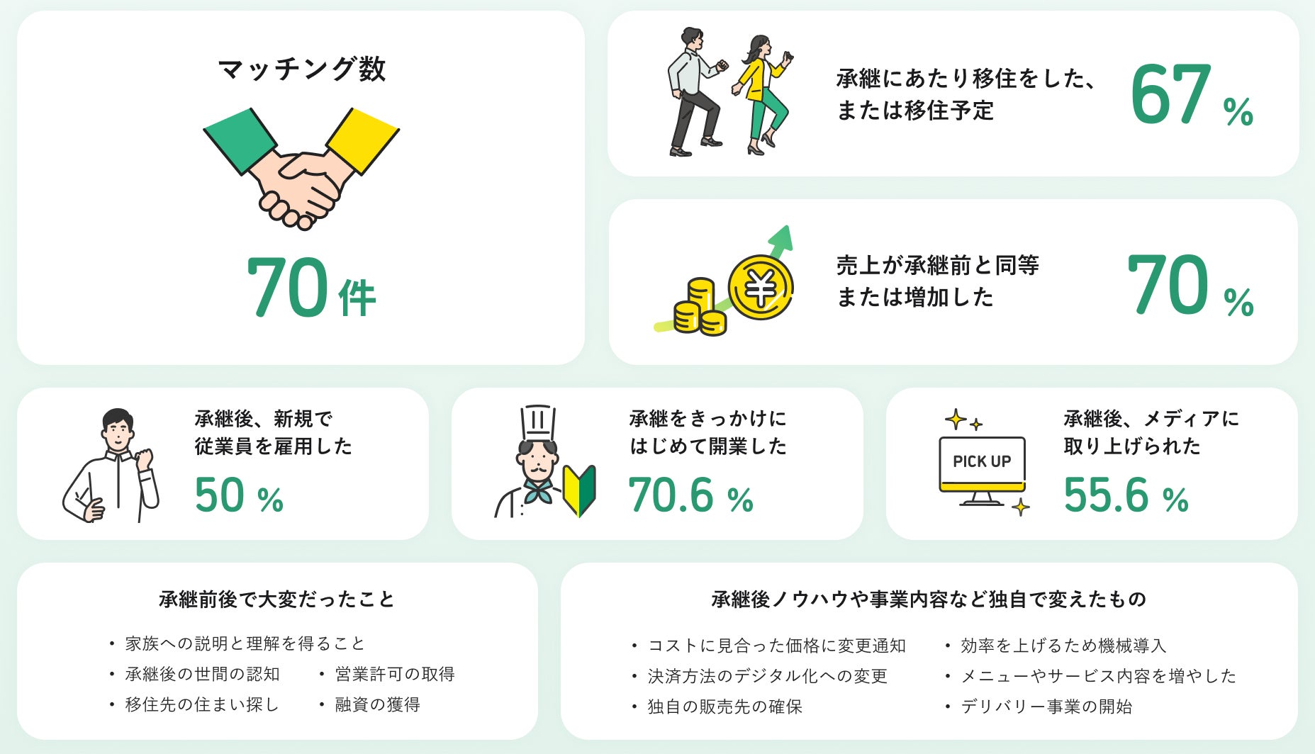 relayでマッチングした買い手へのアンケート調査※によりますと、事業承継により地域に移住をした、あるいは移住予定である方が67%、売上が承継前と同等または増加したと回答した方が70%、承継後に地元雇用を行った方が50%となっており、事業が存続したことで地域経済が循環していることがわかります。
