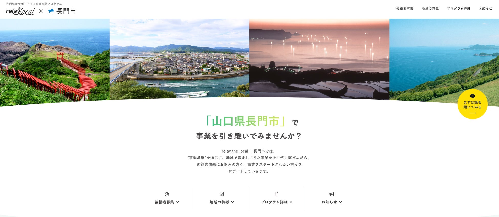 このたび長門市とrelayは、移住・定住を伴う第三者事業承継の推進に向けて、共に取り組んでまいります。提携の第一弾として、長門市に特化した後継者募集案件を掲載した「relay the local 長門市」を開設いたしました。今後、長門市に相談が寄せられる後継者不在事業者の情報をrelayに提供いただき、「relay the local 長門市」への掲載を行います。