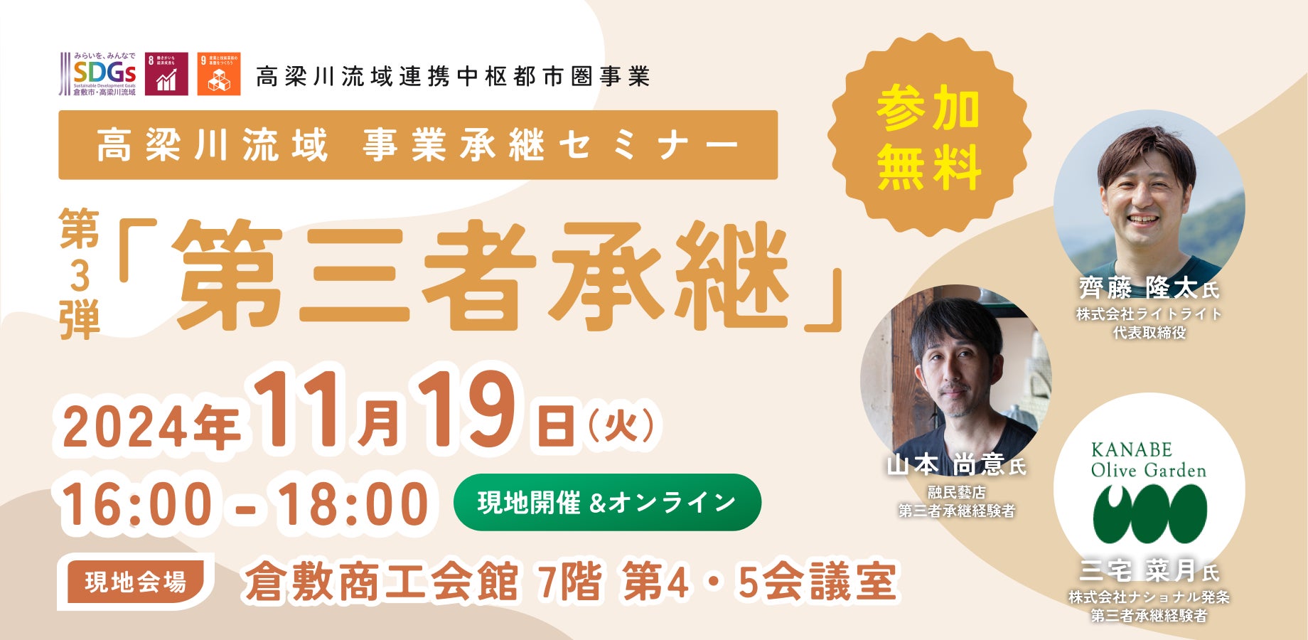 基調講演の他、実際に第三者承継をされた方をお招きしたトークセッションも行い、その可能性について考えるセミナーです。高梁川流域圏内事業者をはじめ、事業承継をお考えやご興味のある方々など、たくさんのご参加をお待ちしております!
