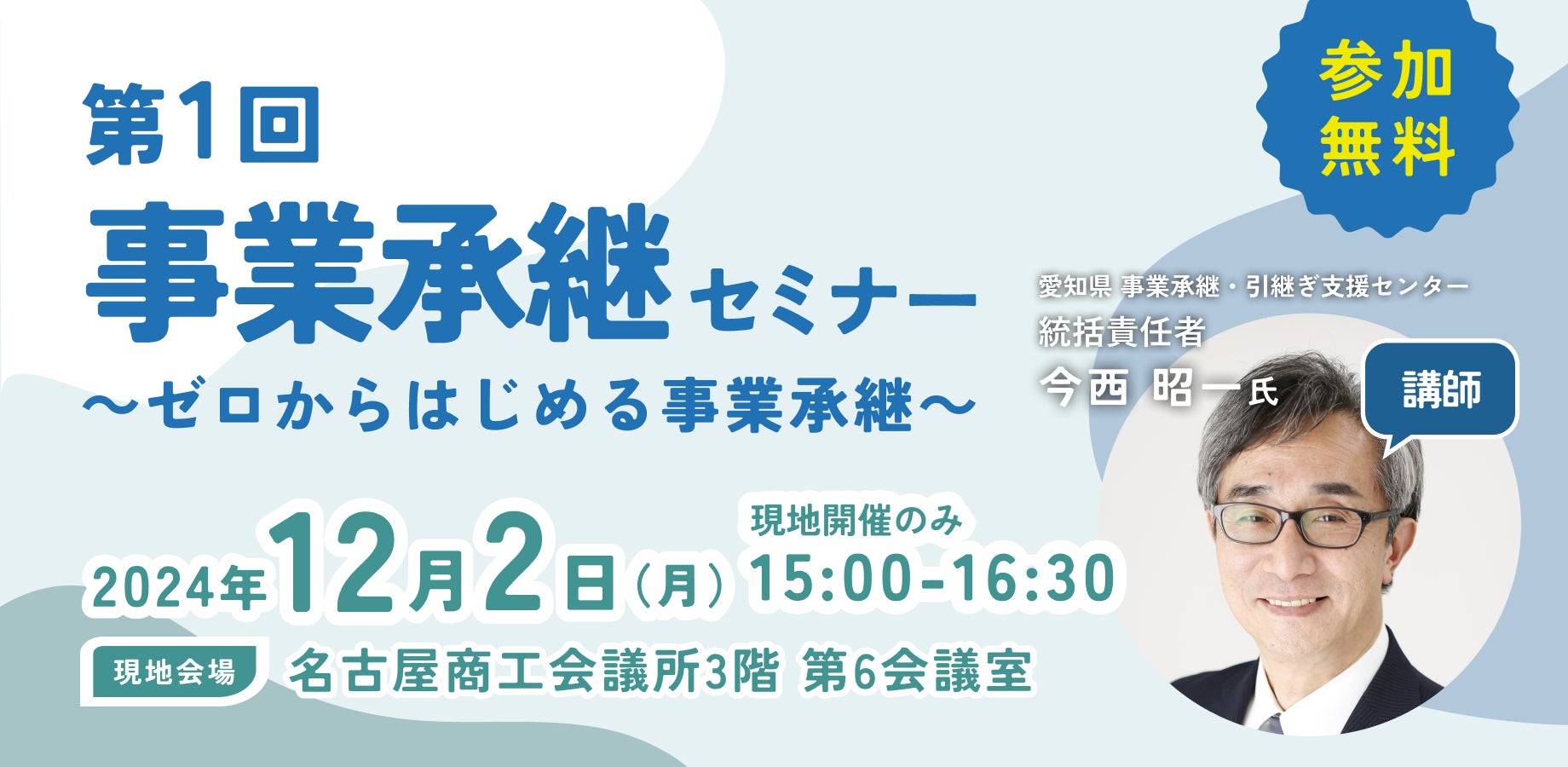 relayと名古屋市は、「そろそろ事業承継について考えたいけれど、何から始めてよいか分からない」という中小企業の経営者などを対象に、事業承継の基本的な知識や進め方などを紹介するセミナーを開催いたします。当日は、支援機関である愛知県事業承継・引継ぎ支援センターによる個別相談会も実施いたします。