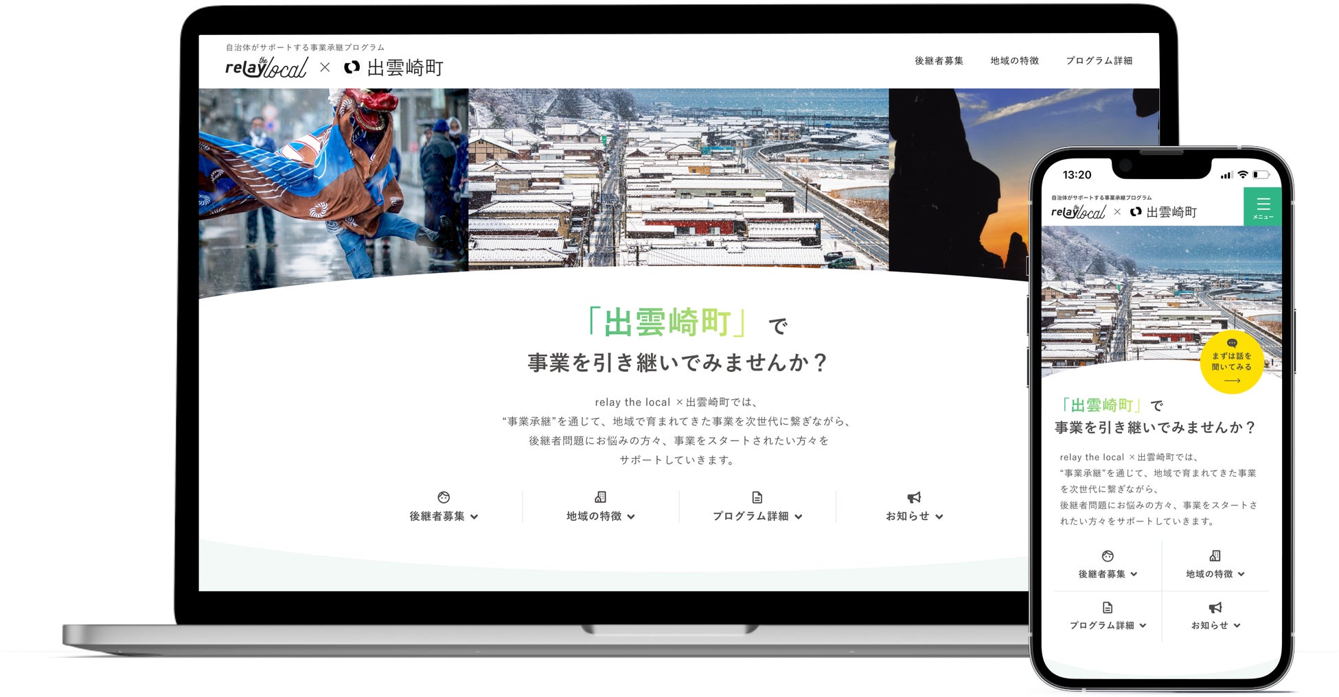 このたび出雲崎町とrelayは、移住・定住を伴う第三者事業承継の推進に向けて、共に取り組んでまいります。提携の第一弾として、出雲崎町に特化した後継者募集案件を掲載した「relay the local 出雲崎町」を開設いたしました。今後、出雲崎町に相談が寄せられる後継者不在事業者の情報をrelayに提供いただき、「relay the local 出雲崎町」への掲載を行います。